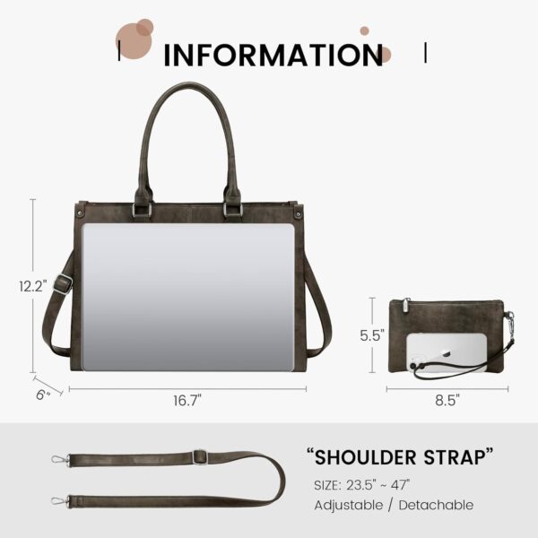 - 👩PERFECT SIZE WORK BAG ☛ Work tote bag for women is 16.7″ x 6″ x 12.2″(L*W*H). Net weight: 3 lb. Distance from top handle to the bag: 8”. The adjustable shoulder strap is 23.5~47 inches long. Can be carried in several ways as an office briefcase or handbag, shoulder bag, or crossbody bag as well, which is convenient and comfortable. Suitable for most 13″/14″/15″/15.6″ laptops.