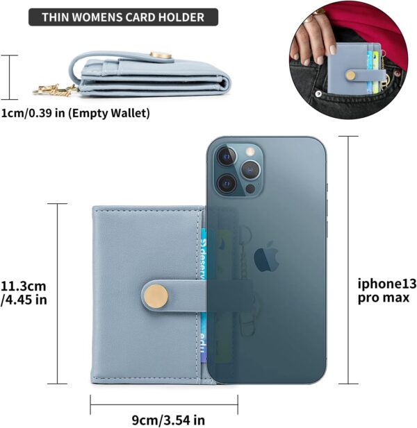 - Ultra-thin Design Keychain Wallet: Small credit card holder for women size is 3.54”L x 0.39″ W x 4.45″ H (inches).Slim,lightweight and compact enough to fit in your pocket, handbag or backpack.What’s more,this compact wallets for women has a gold keychain to manage your keys,even hang in your bag, free up your hands.It is a slim card holder wallet convenient to take it everywhere,travel,casual daily use etc.