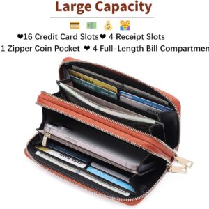 - 【Double Zipper Wallet】It consists of two large zip compartments. Roomy card holder wallet which has 16 credit card slots, 4 hidden receipt slots, 4 spaces for cash and 1 zipper coin pocket. Both sides can be used to store cell phones, passports, checkbooks, stamp cards, and other clutter