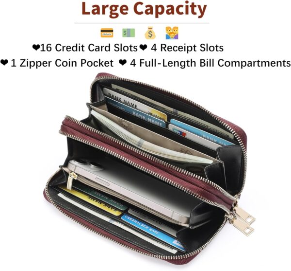 - 【Double Zipper Wallet】It consists of two large zip compartments. Roomy card holder wallet which has 16 credit card slots, 4 hidden receipt slots, 4 spaces for cash and 1 zipper coin pocket. Both sides can be used to store cell phones, passports, checkbooks, stamp cards, and other clutter
