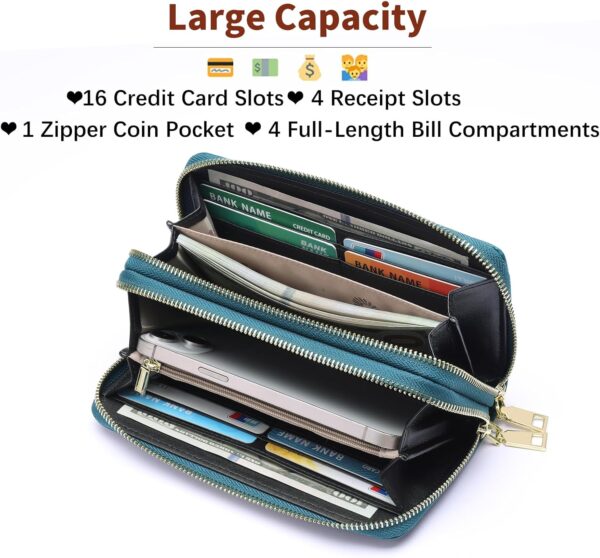 - 【Double Zipper Wallet】It consists of two large zip compartments. Roomy card holder wallet which has 16 credit card slots, 4 hidden receipt slots, 4 spaces for cash and 1 zipper coin pocket. Both sides can be used to store cell phones, passports, checkbooks, stamp cards, and other clutter